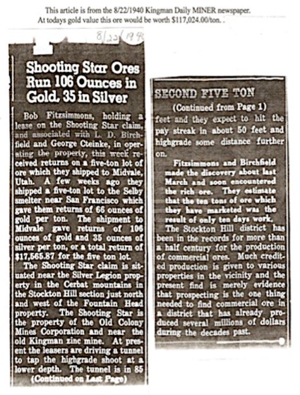 From 1918 to 1940 little to nothing was heard of this discovery. In 1940 a new lessee Bob Fitzsimmons was on the scene and discovered gold of unheard quality, about 20 times higher than anything ever found in America. The gold was found on the surface while trenching to the northwest only several hundred feet above the old main shaft. Records indicate the discovery was on around mid-May. Rumors abounded for months all around Kingman about an incredible find beyond belief on Stockton Hill by the lessees of the claim. On August 20 1940 Elgin Holt reported details of the discovery by letter to unknown recipients about the discovery said to be on a claim owned by the Andy Goodwell Estate operated by the Old Colony Mine Corp. In this report he stated that he confirmed with the Valley Bank that $17,565.87 was received from a smelter return for a 4.87-ton shipment of ore from the Shooting Star. I discovered this report in a document from the archives of the Az. Dept of Mines. Obviously, the claim location was kept secret but it was reported as being midst a number of rich mines such as Fountain Head, Banner, Cupel and others.