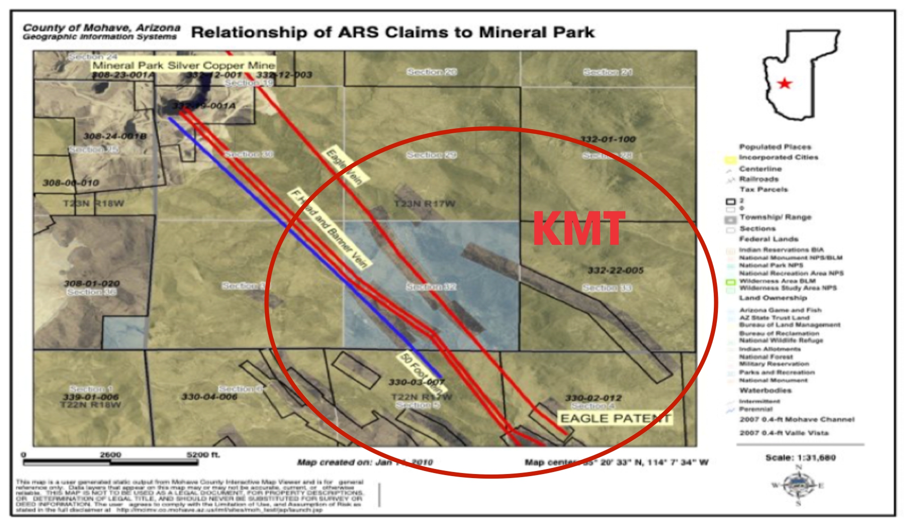 KMT is located 100 miles S.W. from Las Vegas in Mohave County Arizona and across the Cerbat Mountains ridge from Mineral Park. Mining in the area began in 1871. The mines produced primarily silver, gold, copper, lead and zinc. A 2013 report said that the Mineral Park Mine (across the ridge from KMT) now represented one of the largest copper reserves in the United States and the world.